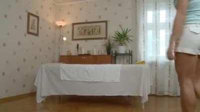 Seksowna młoda blondynka z dużymi cyckami cała wysmarowana oliwką dostaje masaż od faceta i tak go podnieca, że dostaje mocne rżnięcie i wytrysk do środka.