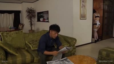 Azjatycka ładna i młoda pokojówka posprzątała dom a teraz chętnie obsłuży gościa gospodarza - obciągnie mu chuja i połknie ze smakiem porcję spermy!
