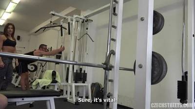 Ładna młoda brunetka po treningu pierdoli się w saunie z obcym facetem za kasę, daje ruchać w pozycjach, oblać spermą i widać, że bardzo to lubi!