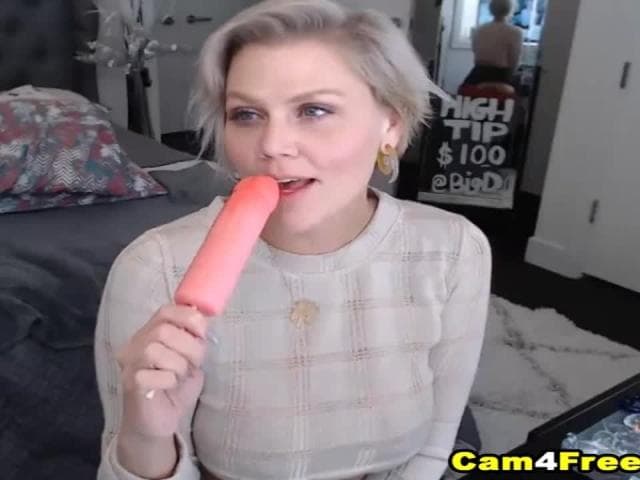 Seksowna blondynka kusi widzów sceną lizania smacznego loda, obciągania dildo, pieszczenia dużej pizdy i pokazywania soczystych dużych cycków, zobacz!