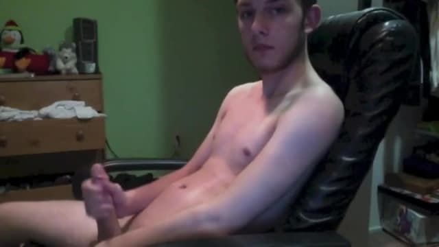 Młody chłopak siedzi wygodnie w fotelu całkiem nagi i masturbuje swojego dużego kutasa póki się nie spuści - to jego wielka przyjemność, zobacz!