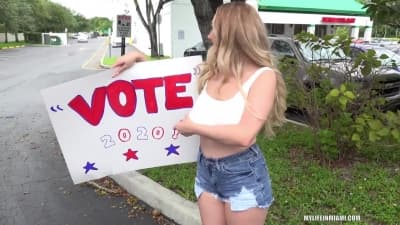 Blondynka Skylar Vox uwiedzie nimi każdego faceta! Ten szybko jedzie z nią do domu, daje minetę, pierdoli obciągniętym chujem i spuszcza się w jej usta!
