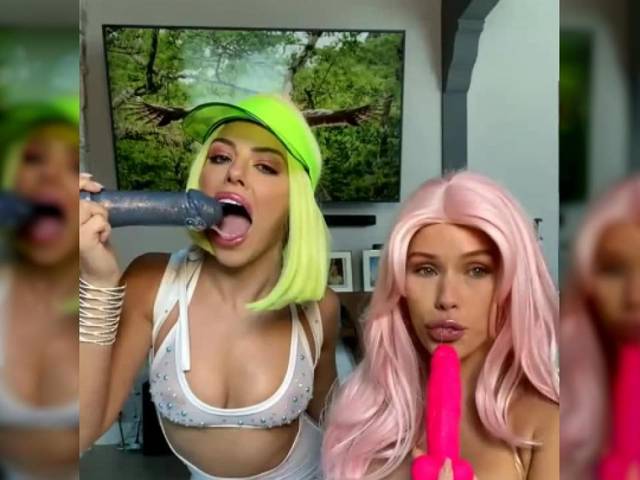 Dwie ładne lesbijki, Adriana Chechik i jej kochanka z owłosioną pizdą ubrane w peruki cosplay pokażą wesołą masturbację przed kamerą z pomocą seks zabawek