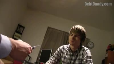 Młody szczupły brunet ma długi za wynajem mieszkania a ponieważ nie ma pieniędzy chce zapłacić seksem. Obciąga kutasa właściciela lokalu i daje się wyjebać