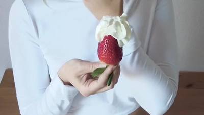 Młoda internetowa modelka masturbuje się przed kamerą z pomocą palców jednej ręki kiedy drugą w tym czasie karmi się wielką truskawką, seksowny pomysł!