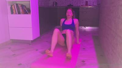 Rudowłosa nastolatka włożyła stringi i sportowy stanik, rozłożyła matę do jogi i w fioletowym świetle ćwiczy różne pozycje odwrócona tyłem do kamery.