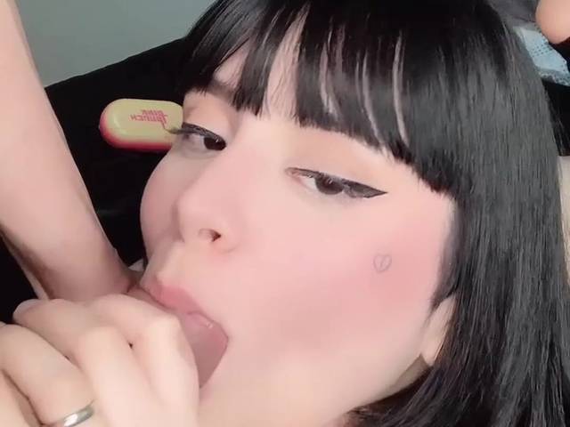 Śliczna nastoletnia brunetka w seksownej czarnej bieliźnie klęczy przed kochankiem z jego chujem w ustach i obciąga go głębokim gardle jak profesjonalistka