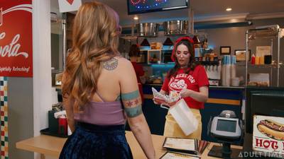 Pracownica nie ma sosu musztardowego do hot doga, więc wyciąga swojego grubego straponowego kutasa i wali w niego! Potem wszyscy dobrze się bawią, waląc sobie sztuczne kutasy