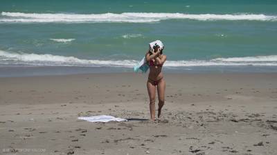 Przybywając na plażę, ta blondynka zdejmuje strój kąpielowy, abyśmy mogli zobaczyć, jak pięknie wygląda nago. Jej okrągłe cycki sprawiają, że szalejemy z rozkoszy na jej widok.