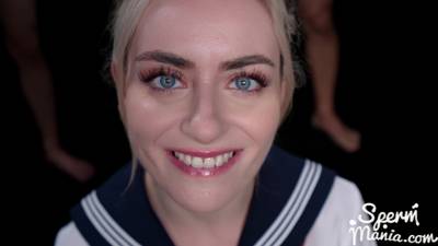 Połykająca spermę blond żeglarka Emily Belle w gangbangu