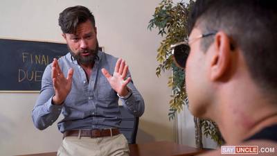 Ten student twink potrzebuje dobrych ocen, więc drażni i uwodzi swojego profesora DILF! Zdejmuje koszulę i spodnie i zaczyna ssać jego kutasa