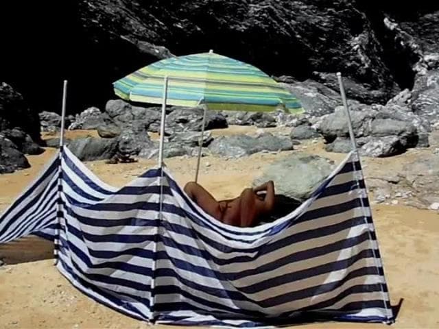 Ta dojrzała, gruba dziwka leży na plaży w pełnym słońcu i masturbuje palcami swoją dużą, wygłodniałą pizdę zupełnie bezwstydnie a filmuje ją mąż!